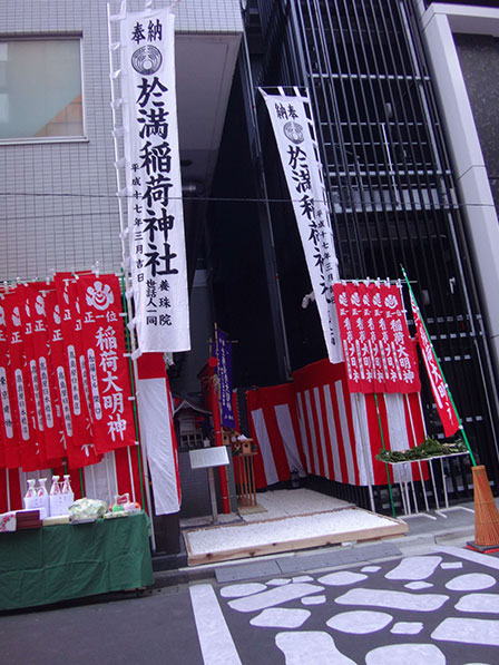 於満稲荷は日本橋に住む商人たちが於満の方の遺徳を称え、現在も厚く信仰されている稲荷であります。