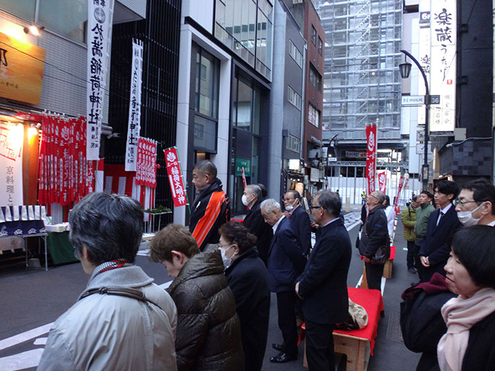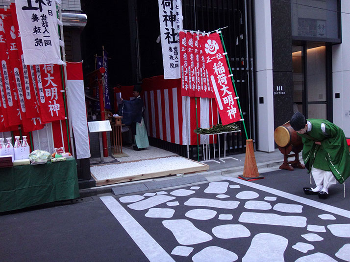 明暦の大火から江戸が復興する過程に稲荷を町内に勧請しました。その後も江戸経済の発展を支えた日本橋の商人によって、熱く信仰されるようになり、地域の於満稲荷信仰は絶えることがありません。初午祭が始まった時期は定かではありませんが、少なくとも戦後から現在に至る迄の約70年間にわたり開催されています。